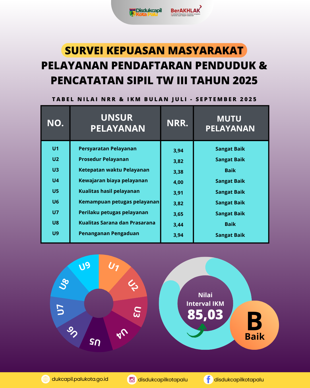 Dukcapil kota Palu selalu lakukan survei tingkat kepuasan masyaakat yang diperoleh dari hasil pengukuran secara kuantitatif dan kualitatif atas pendapat masyarakat dalam memperoleh pelayanan dari aparatur penyelenggara pelayanan publik dengan membandingkan antara harapan dan kebutuhannya.