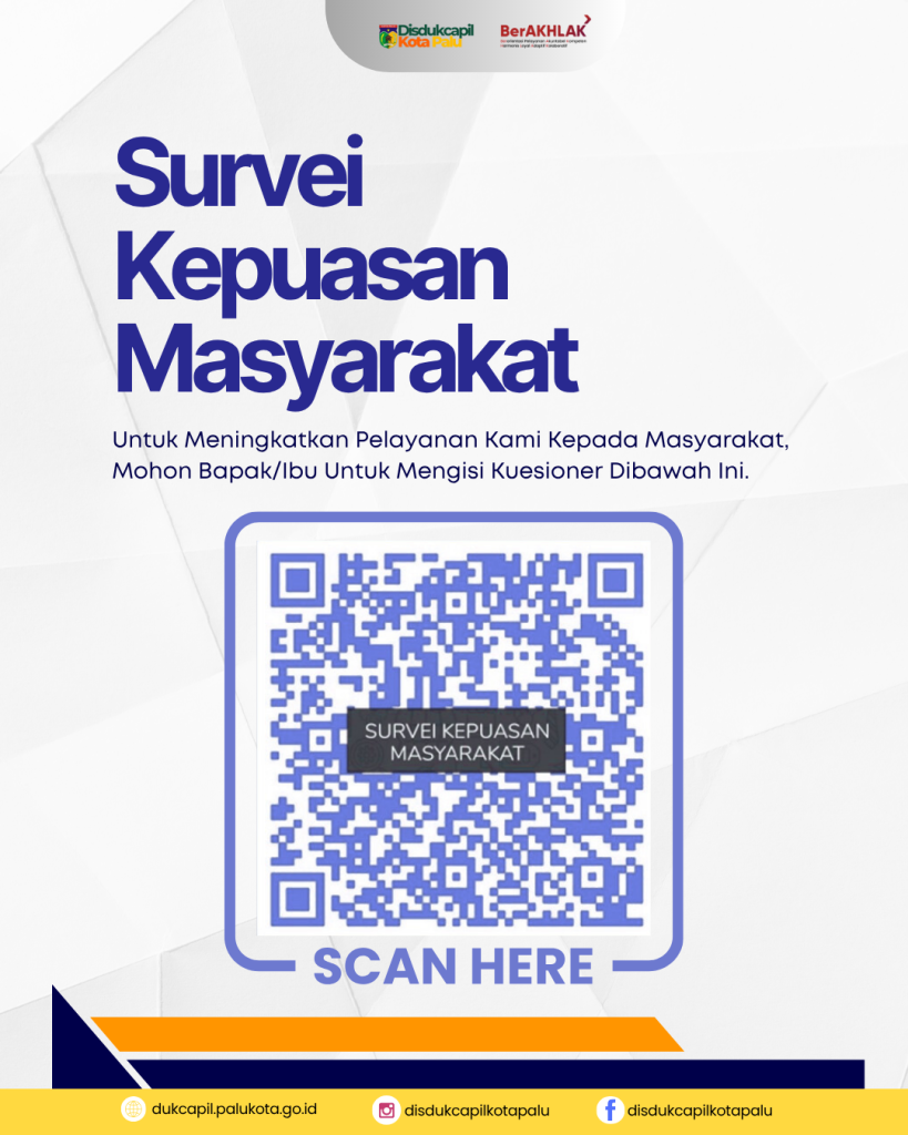 Mari dukung Dinas Kependudukan Dan Pencatatan Sipil (DUKCAPIL) Kota Palu dalam meningkatkan kualitas pelayanan dengan mengisi Survei Kepuasan Masyarakat.